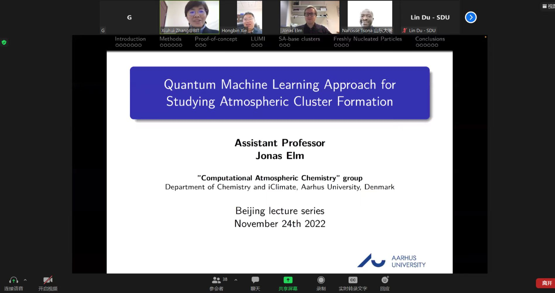 2022年11月24日下午,由北京理工大學(xué)研究生院主辦,化學(xué)與化工學(xué)院承辦的北理工“21世紀(jì)學(xué)科前沿”系列講座在騰訊會議線上舉行。應(yīng)化學(xué)與化工學(xué)院張秀輝教授的邀請,奧胡斯大學(xué)Jonas Elm助理教授做了題為“Quantum Machine Learning Approach for Studying Atmospheric Cluster Formation”的學(xué)術(shù)報告。近四十名師生參加了講座并進(jìn)行學(xué)術(shù)交流。