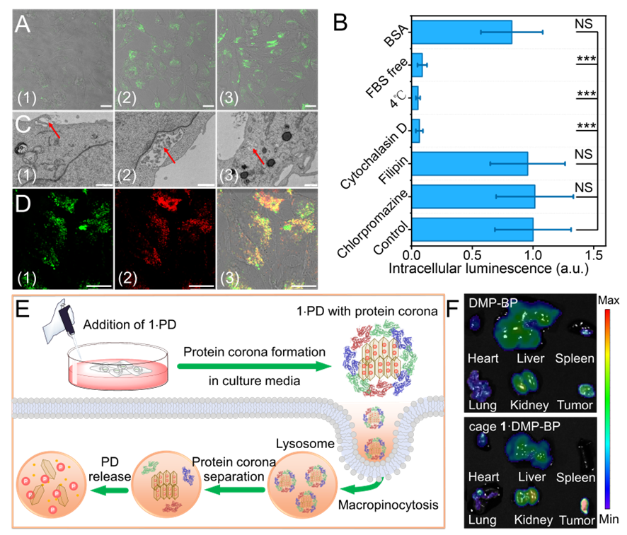 本研究進(jìn)一步探究了蛋白對(duì)cage 1遞送PD的作用。首先,共聚焦成像(CLSM)分析顯示,復(fù)合物的細(xì)胞攝取高度依賴(lài)血清蛋白(圖4A, 4B):在含胎牛血清(FBS)或BSA的培養(yǎng)基中,胞內(nèi)熒光強(qiáng)度顯著提升,而無(wú)蛋白條件下PDs的內(nèi)化效率顯著降低,表明蛋白冠通過(guò)疏水屏蔽作用維持PDs與cage 1的結(jié)合穩(wěn)定性。動(dòng)態(tài)光散射(DLS)研究表明,cage 1?PD復(fù)合物在含血清環(huán)境中形成~200 nm納米聚集體(適配大胞飲途徑);而無(wú)血清條件下因缺乏蛋白冠保護(hù)導(dǎo)致聚集體尺寸增至~4.2 μm。熒光共振能量轉(zhuǎn)移(FRET)分析進(jìn)一步證實(shí)cage 1可介導(dǎo)血清白蛋白(BSA)與PDs形成穩(wěn)定三元復(fù)合物,而游離PDs無(wú)此結(jié)合特性。最后,本研究深入探究了配合物的細(xì)胞內(nèi)化機(jī)制。通過(guò)配合物內(nèi)吞抑制實(shí)驗(yàn)結(jié)合透射電鏡(TEM)(圖4C)觀察到的特征性細(xì)胞膜內(nèi)陷及直徑>500 nm的囊泡結(jié)構(gòu),確認(rèn)大胞飲作用為其主要攝取途徑。PDs與溶酶體共定位實(shí)驗(yàn)進(jìn)一步揭示配合物經(jīng)大胞飲內(nèi)吞后靶向溶酶體/內(nèi)體區(qū)室(圖4D),PDs的釋放過(guò)程與蛋白質(zhì)冠解離及溶酶體酸化微環(huán)境存在協(xié)同作用(圖4E)。體內(nèi)分布實(shí)驗(yàn)證實(shí)cage 1?PD配合物通過(guò)增強(qiáng)滲透與滯留(EPR)效應(yīng)實(shí)現(xiàn)腫瘤組織特異性積累,其腫瘤區(qū)域熒光強(qiáng)度較游離藥物提升(圖4F)。這種具有腫瘤選擇性的遞送方式可實(shí)現(xiàn)磷/膦酸鹽類(lèi)治療藥物(包括核苷酸類(lèi)似物和寡聚核酸藥物)的精確靶向,從而有效抑制腫瘤和進(jìn)行聯(lián)合治療,推動(dòng)精準(zhǔn)腫瘤學(xué)的前沿發(fā)展。