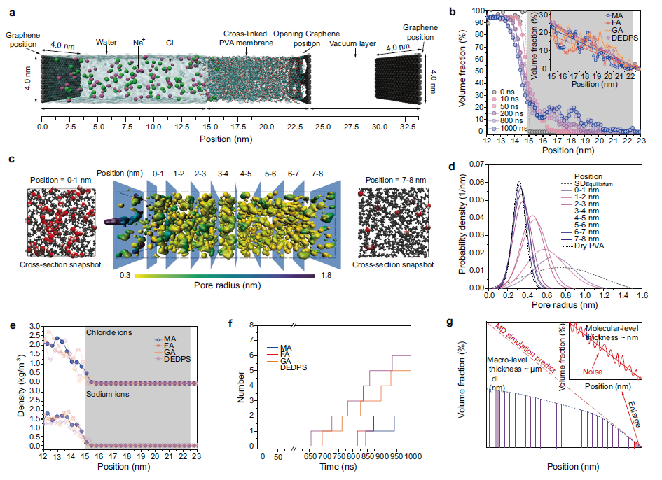 如圖2a和b所示,交聯(lián)能夠顯著抑制PVA薄膜在水溶液中的溶脹,從而在水溶液及PVA之間形成清晰的相界面。對(duì)膜內(nèi)氫鍵數(shù)的動(dòng)態(tài)分析表明,水分子塑化PVA的過程伴隨有其對(duì)PVA鏈間氫鍵的破壞(圖2c、d和e)。水分子對(duì)PVA強(qiáng)烈的塑化效應(yīng)導(dǎo)致了孔徑分布的均值和方差皆顯著增大,膜內(nèi)部分微孔轉(zhuǎn)變?yōu)榻榭祝▓D2f)。