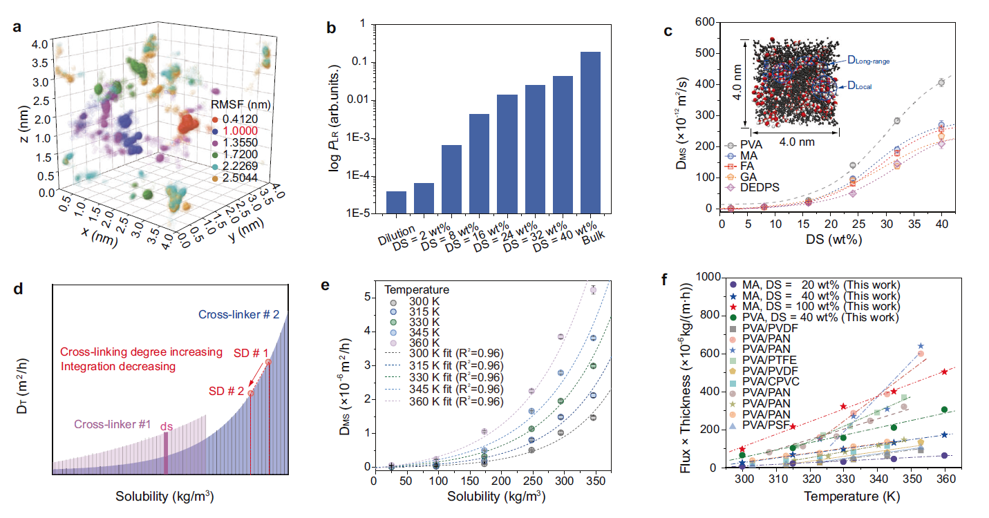 如圖5a所示,水分子的擴(kuò)散軌跡表明其在膜內(nèi)的擴(kuò)散存在長程擴(kuò)散和局部擴(kuò)散兩種模式,長程擴(kuò)散發(fā)生的概率會(huì)隨PVA膜溶脹度的上升而指數(shù)上升(圖5b),解釋了膜內(nèi)水分子擴(kuò)散系數(shù)隨溶脹度快速上升的原因(圖5c)。結(jié)合自由體積理論,證明了膜內(nèi)水分子的擴(kuò)散系數(shù)與溶解度的函數(shù)關(guān)系為指數(shù)函數(shù)(圖5d和e)。進(jìn)一步將該函數(shù)關(guān)系與Flory-Huggins方程及Maxwell-Stefan方程聯(lián)立,得到了計(jì)算PVA膜滲透通量的基本數(shù)學(xué)模型。