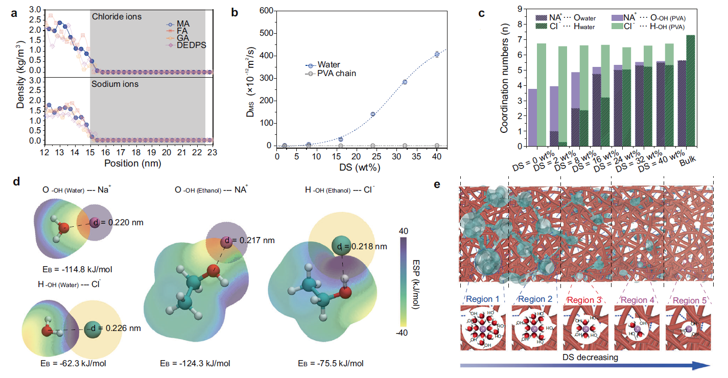 鹽離子難以在PVA中溶解(圖4a),并且膜溶脹度較高時(shí),水分子在PVA膜內(nèi)的擴(kuò)散系數(shù)遠(yuǎn)高于鹽離子擴(kuò)散系數(shù)(圖4b),該結(jié)果從溶解、擴(kuò)散的角度解釋了PVA膜高脫鹽率的成因。此外,當(dāng)膜孔小于或接近離子水合尺寸時(shí),水合層減小以適應(yīng)膜孔,PVA分子鏈通過補(bǔ)償鹽離子與水合層內(nèi)水分子的相互作用,使鹽離子在膜內(nèi)的擴(kuò)散系數(shù)減小。通過研究鹽離子與水分子及PVA鏈上羥基的配位數(shù)解析了該跨膜補(bǔ)償機(jī)制。如圖4c所示,溶脹度較高(>24 wt%)時(shí),膜的孔隙尺寸大于離子的水合尺寸,故鹽離子與水分子的配位數(shù)受到溶脹度的影響較小。隨著溶脹度降低,鹽離子逐漸從水合層中裸露,并與PVA分子鏈發(fā)生相互作用。