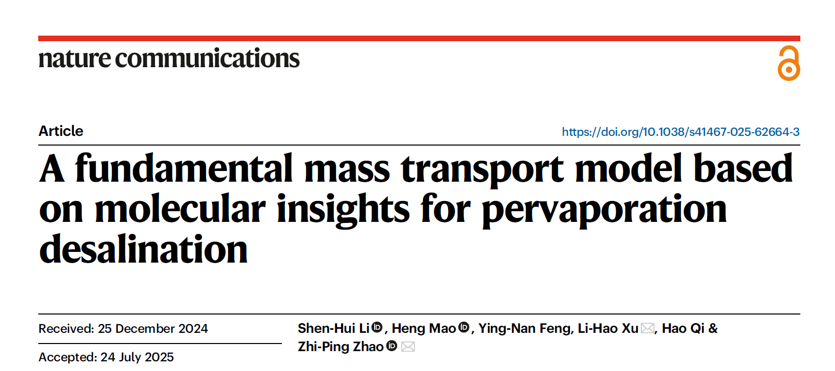 2025年8月11日,北京理工大學(xué)化學(xué)與化工學(xué)院趙之平教授團(tuán)隊(duì)在滲透汽化脫鹽機(jī)理研究方面取得重要進(jìn)展,在Nature Communications上發(fā)表題為“A fundamental mass transport model based on molecular insights for pervaporation desalination”的研究論文。該論文的第一作者為博士研究生李申輝,通訊作者為趙之平教授和徐李昊教授,北京理工大學(xué)是該工作的獨(dú)立完成單位。