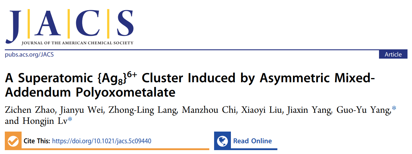 近日,北京理工大學化學與化工學院楊國昱教授、呂紅金教授研究團隊在非對稱多金屬氧簇(Polyoxometalates, POMs)導向的銀團簇合成領域取得重要進展。研究團隊開發(fā)了一種非對稱POM誘導合成策略,成功制備了由六個氧化還原活性混配型P2W15Nb3配體包裹的{Ag8}6+超原子團簇,(C16H36N)6Na4H24[Na2Ag8(P2W15Nb3O61)6]·36CH3CN ({Ag8@(P2W15Nb3)6})。研究工作以“A Superatomic {Ag8}6+ Cluster Induced by Asymmetric Mix-Addendum Polyoxometalate”為題發(fā)表在國際頂級期刊《Journal of the American Chemical Society》。北京理工大學為唯一通訊單位,楊國昱教授和呂紅金教授為論文通訊作者,化學與化工學院博士生趙梓辰為論文第一作者,寧夏大學魏建宇副教授和東北師范大學郎中玲副教授在理論計算方面給予了大力支持。此項研究得到了國家海外高層次人才引進計劃、國家自然科學基金、北京理工大學高層次人才啟動計劃等項目的資助以及北京理工大學分析測試中心的支持。