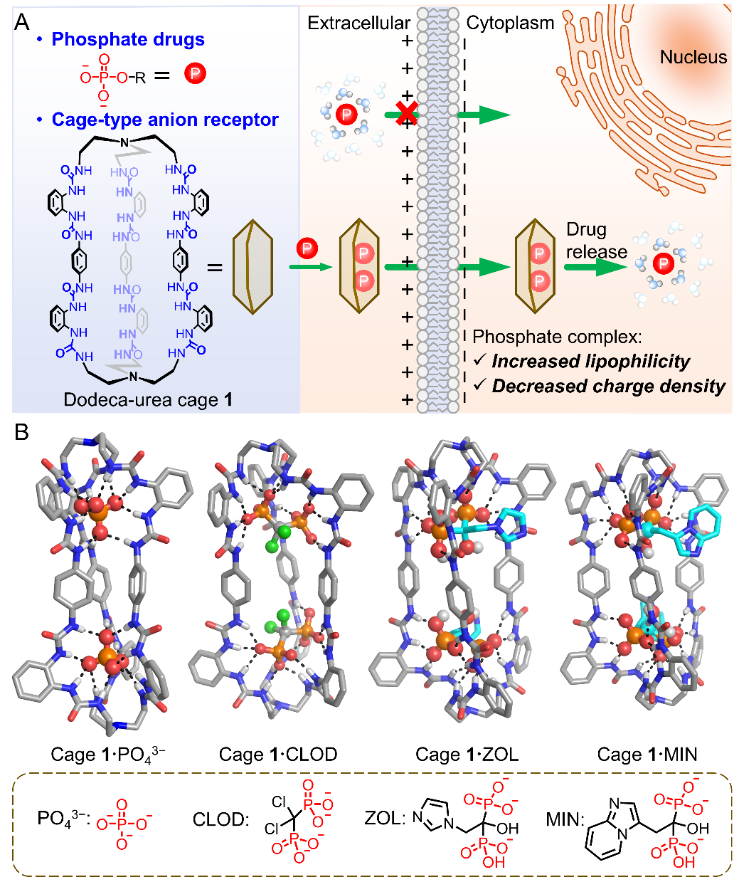 磷/膦酸基團是抗病毒、抗腫瘤及抗骨質疏松藥物的關鍵活性基團,然而其高親水性和多重負電荷特性嚴重阻礙該類藥物的跨膜轉運,導致生物利用度低(例如,臨床使用的雙膦酸鹽的生物利用度僅為1%)。為提高磷/膦酸鹽藥物(PDs)療效并減少其副作用,現(xiàn)有策略包括:(1)小分子酯化修飾,以增強親脂性,但需要對藥物分子逐一進行修飾;(2)納米顆粒載體,雖具廣泛的藥物適應性,卻存在載藥量批次間差異大的問題而導致臨床應用受限制。針對上述科學問題,亟待開發(fā)可通過明確結構實現(xiàn)明確的藥物負載且具有廣譜藥物適應性的載體。單分子載體憑借分子級精準封裝能力成為新興解決方案。然而,具有水合能高、幾何形狀復雜的磷/膦酸藥物與載體間有效結合是極具挑戰(zhàn)性的。目前的研究僅有兩例陽離子型環(huán)糊精衍生物作為分子載體通過靜電作用結合三磷酸鹽實現(xiàn)細胞水平的遞送(Sci. Rep. 2017, 7, 8353.;Angew. Chem. Int. Ed. 2018, 57, 9891-9895.)。