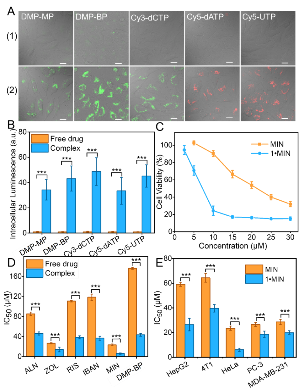 為評估cage 1對PDs的遞送效果,本研究首先測試了cage 1對多種腫瘤細胞(如HeLa、HepG2、MDA-MB-231、PC-3和 4T1)的細胞毒性,即使在100 μM條件下,細胞存活率仍顯著高于安全閾值,凸顯其優(yōu)異的生物相容性。本研究首先采用熒光標記的單磷酸鹽、雙膦酸鹽(BPs)及三磷酸鹽作為模型藥物,通過共聚焦顯微鏡直觀展示了復合物的胞內積累效果。結果顯示,cage 1?PDs復合物處理的細胞其熒光強度較游離藥物組顯著增強了33~45倍(圖3A, 3B),文獻中帶正電荷的環(huán)糊精遞送的PD在MCF7細胞中的熒光強度只提高了5倍。抗腫瘤細胞增殖實驗進一步證明,相比起游離的雙膦酸鹽,cage 1遞送的雙膦酸鹽對腫瘤細胞對腫瘤細胞的增殖抑制效率提升2-4倍(圖3C, 3D),且該效果在多種細胞系中均保持一致(圖3E)。相較于與原藥酯化(提高1.3倍)或非靶向單功能雙膦酸鹽納米載體(效果忽略不計),cage 1展現(xiàn)更優(yōu)越的遞送效率。cage 1通過精準PD藥物負載與可控釋放,為改善磷/膦酸鹽類藥物的臨床療效提供了可靠依據。