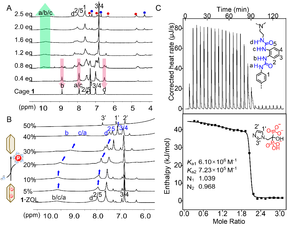 以硫酸根離子為模板,三足三脲前體與1,4-亞苯基二異氰酸酯通過一鍋法反應合成十二脲分子籠(cage 1)。單晶分析表明,cage 1與不同PDs以1:2結合(圖1B),每個陰離子通過多重氫鍵穩(wěn)定結合于六脲單元內。籠狀結構的軸向高度及中間苯環(huán)形成的空腔可動態(tài)調整以適配不同尺寸陰離子。核磁共振(NMR)滴定分析顯示(圖2A),連續(xù)滴定PDs導致cage 1的NH質子產生顯著低場位移,伴隨復合物特征峰的出現(xiàn),證明PDs與cage 1在NMR時間尺度下存在慢交換熱力學結合機制。溶劑極性效應實驗證實,水含量的梯度增加(從0.5%增加至20%(H2O/DMSO-d6))顯著削弱配合物主客體間的氫鍵相互作用(圖2B),導致cage 1與PDs的結合常數呈現(xiàn)數量級遞減:從106 M?1降至104 M?1。由此推演,純水溶液中cage 1與PDs的結合常數將顯著降低(<<10<>4 M?1),再次驗證cage 1在水環(huán)境中能夠高效釋放PDs。等溫滴定量熱法(ITC)測得的復合物1?PD的結合常數Ka1為106~ 107 M?1(圖2C),與磷酸鹽轉運蛋白(Ka = 106 M?1)相當,且不同PD底物間的結合常數差異極小,同樣表明cage 1具有自適應陰離子結合特性。
